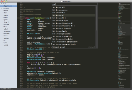 Build 2091 also introduces support for some of OS X Lion's features. Overlay scroll bars are now in there, albeit without support for over-scroll yet. Lion full screen support has been added too, although old style full screen support is a just setting away. There have also been a couple of key binding changes for OS X, to make full screen (now ^⌘F), find (⌘F now shows the find panel only), and replace (⌥⌘F) match the Lion defaults.