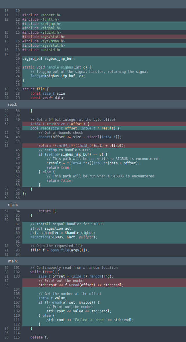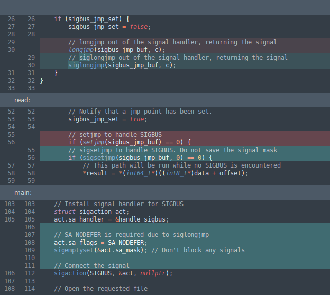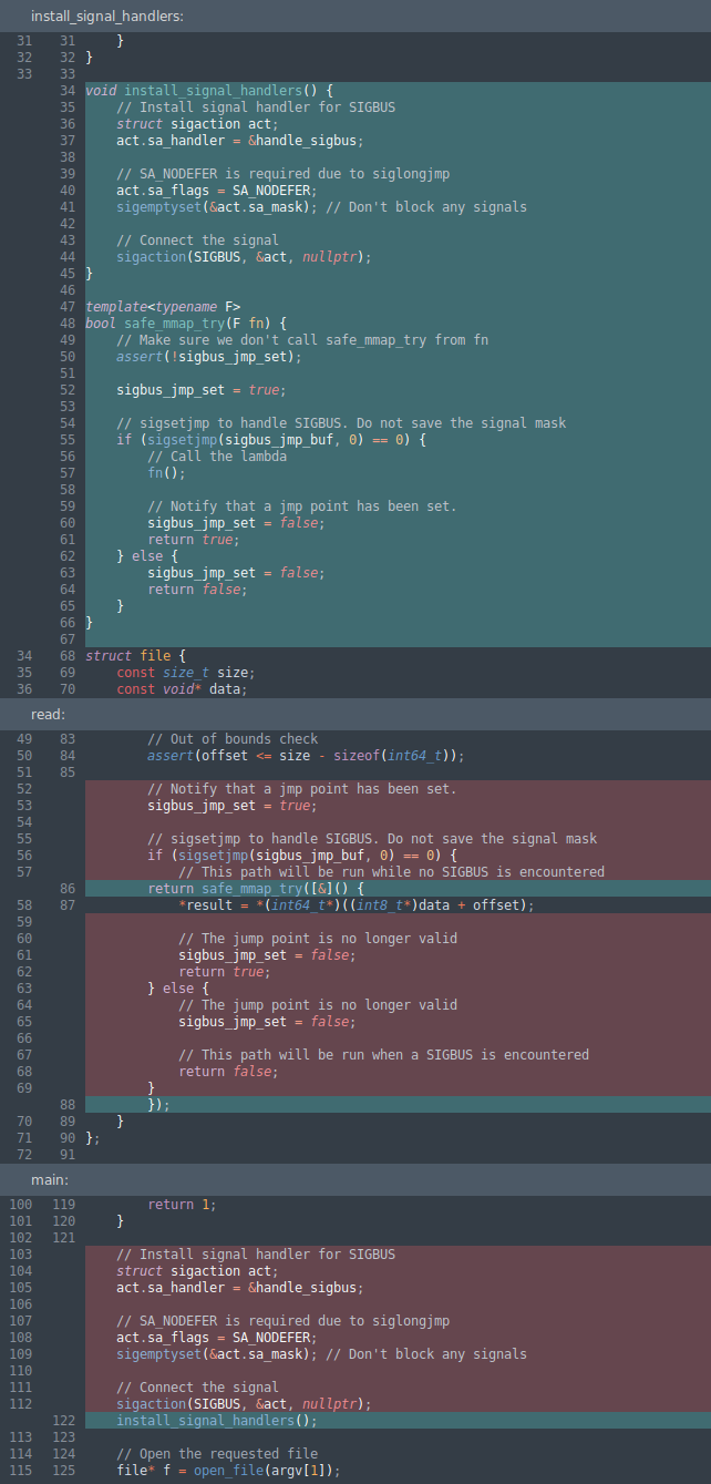 This is starting to get quite complicated, especially if you were to have multiple places where a SIGBUS could happen. Let's factor things out into functions to make the logic a little cleaner.