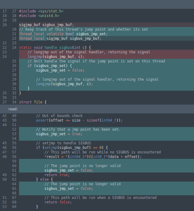 This is starting to get quite complicated, especially if you were to have multiple places where a SIGBUS could happen. Let's factor things out into functions to make the logic a little cleaner.